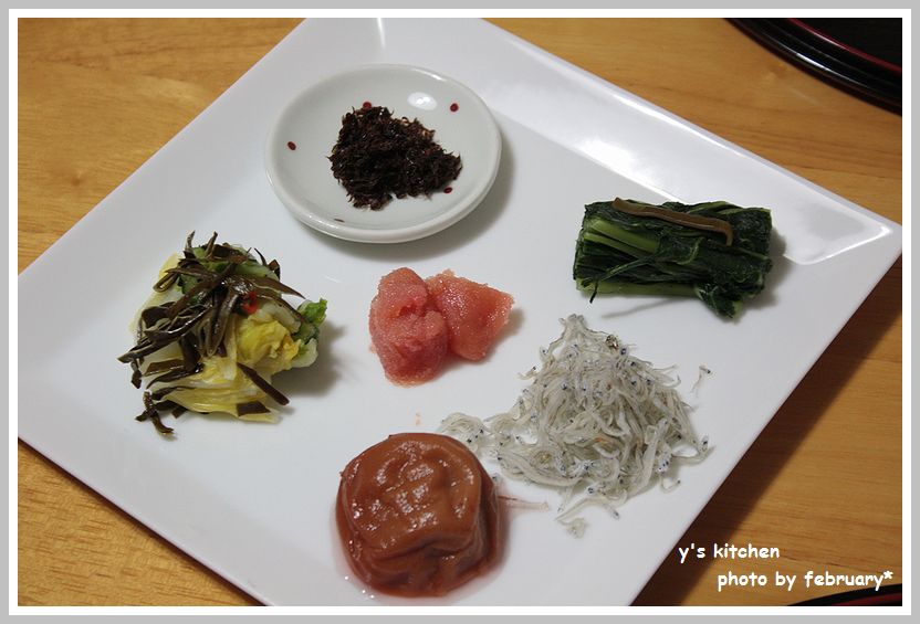 白菜の漬け物、梅干、ちりめんじゃこ、たらこ、広島菜の漬け物、あみ