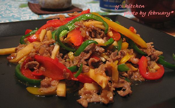 7. 肉の色が変わったら、パプリカ、ピーマン、筍を入れて手早く強火で炒める