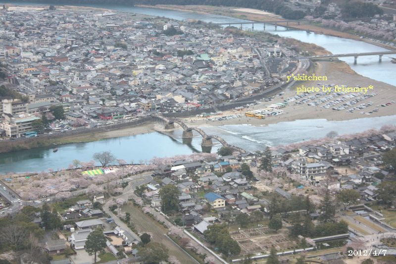 城の展望台から錦帯橋を臨む。