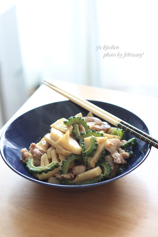 たけのこ、鶏肉、ゴーヤ を 甘めの味噌味で炒めたと思う。