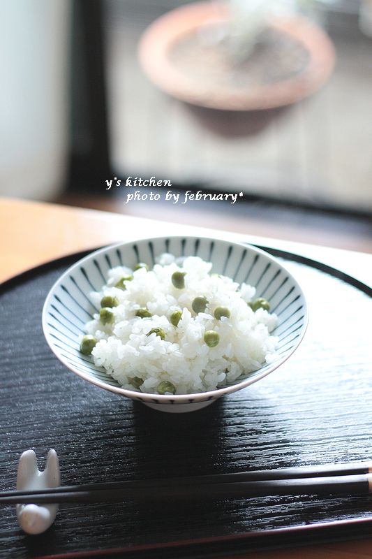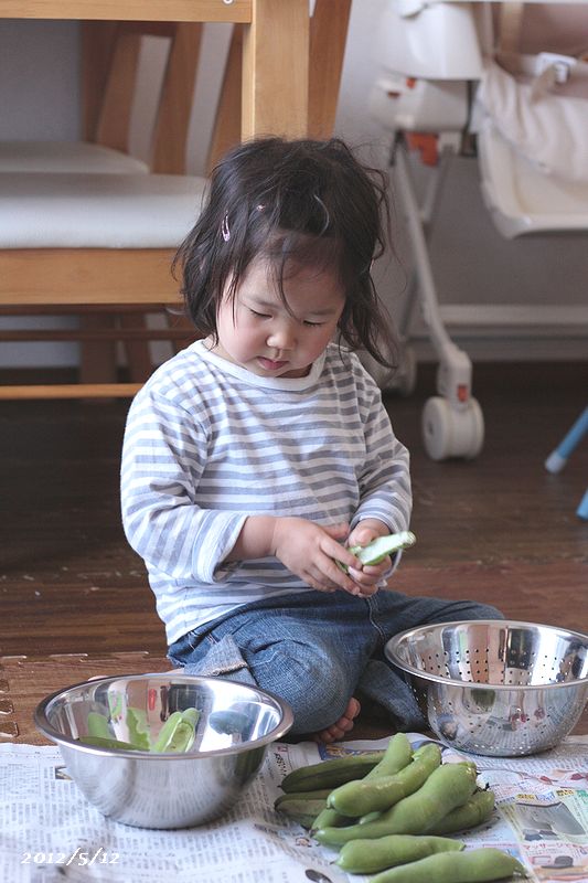 グリーンピースと空豆を、さやから出してもらっています。