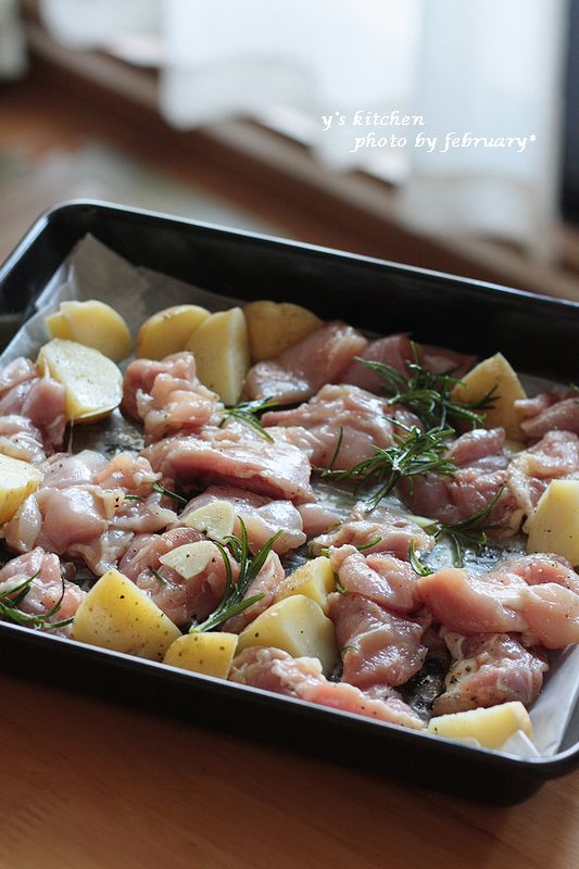 鶏とじゃがいもに塩こしょうして、ローズマリーを散らし、