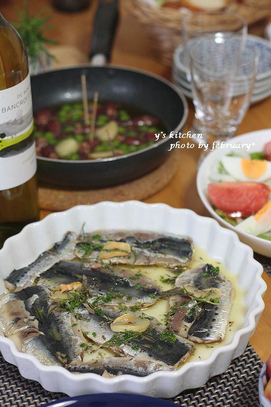 ローズマリー、タイムなどを入れて乳化させ、いい感じになったらイワシにオイルを回しかけました。