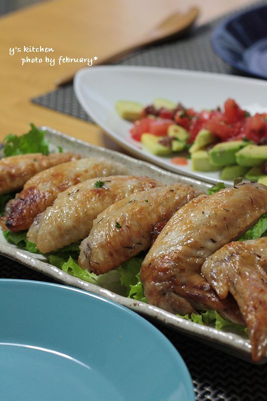 手羽先は、オリーブオイル、レモン汁、にんにく、タイム、塩、こしょうでマリネしてグリル。